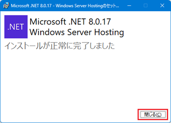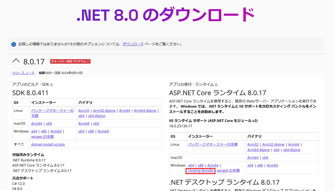 今回は「dotnet-hosting-8.0.17-win.exe」をダウンロードしました。