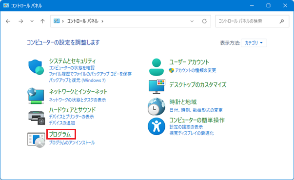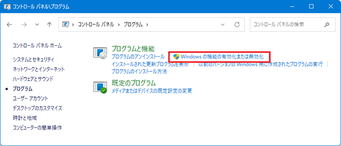 コントロールパネルの「プログラム」をクリックし、さらにプログラムと機能の「Windows 機能の有効化または無効化」をクリックします。