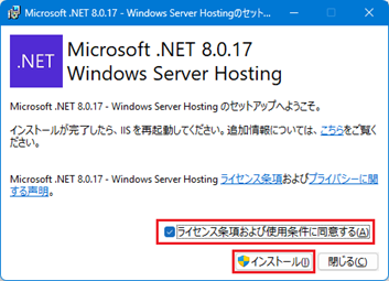 ダウンロードした「dotnet-hosting-8.0.17-win.exe」を起動し、インストールを開始します。