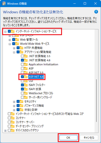 「Windows の機能」画面が表示されるので、ツリーの「インターネット インフォメーションサービス」をチェックし、さらにサブ項目の「ASP.NET 4.8」をチェックし、「OK」をクリックします。