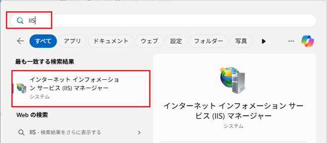 次に、スタートメニューから「IIS マネージャー」を起動し、設定を行います。