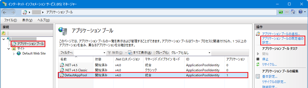一覧で「DefaultAppPool」を選択し、右側の「操作」パネルで「アプリケーション プールの既定値の設定」をクリックします。