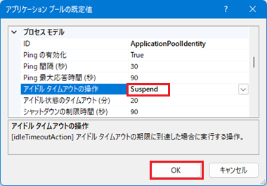 「アプリケーション プールの既定値」ダイアログが表示されるため、プロセスモデルの「アイドルタイムアウトの操作」の設定値を「Suspend」に変更し、「OK」をクリックします。