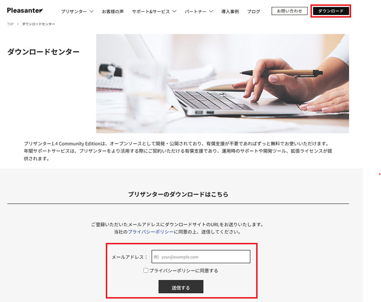 ダウンロードは、公式サイトの右上の「ダウンロード」ページから、メールアドレスを送信して行います。