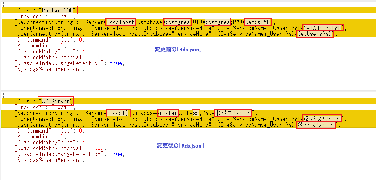 "OwnerConnectionString": "Server=localhost;Database=#ServiceName#;UID=#ServiceName#_Owner;PWD=②パスワード",