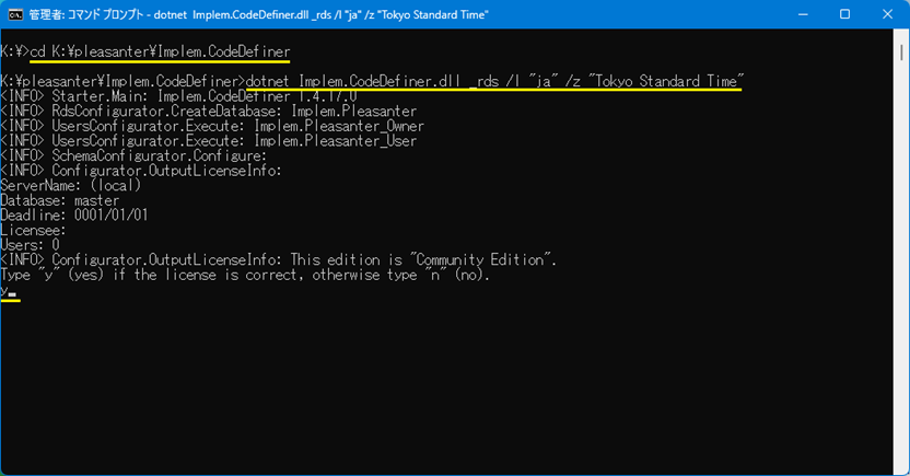 ライセンスの確認メッセージが表示されるため問題なければ、「y」を入力し「Enter」キーを押下します。