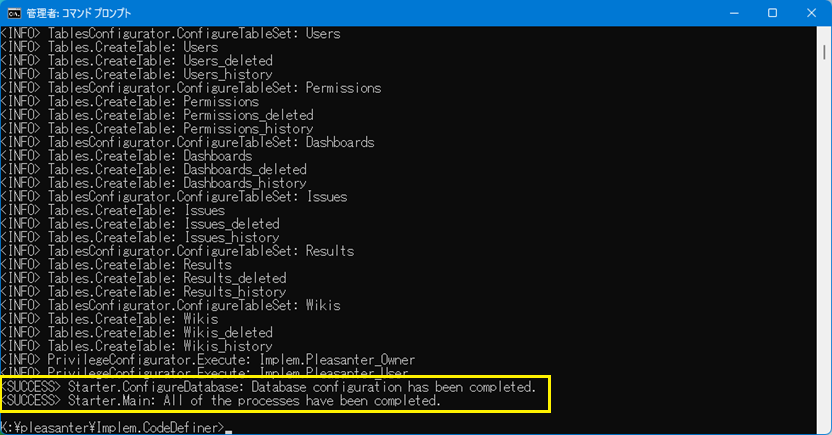 上記のような <SUCCESS> のログが出力されれば、データベースの作成は完了です。