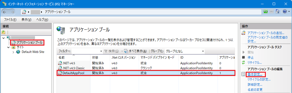 一覧で「DefaultAppPool」を選択し、右側の「操作」パネルで「基本設定」をクリックします。