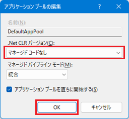 「アプリケーションプールの編集」の「.Net CLR バージョン」で「マネージド コードなし」を選択して、「OK」をクリックします。