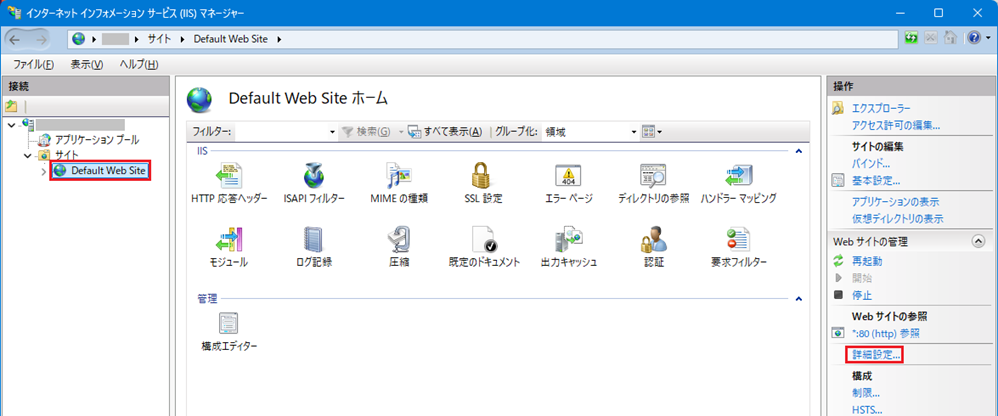 左側のツリーで「サイト」→「Default Web Site」を選択し、右側の「Web サイトの管理」パネルで「詳細設定」をクリックします。