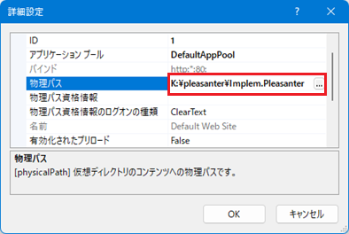 「詳細設定」の「物理パス」を 下記の Pleasanter のフォルダのパスに変更します。