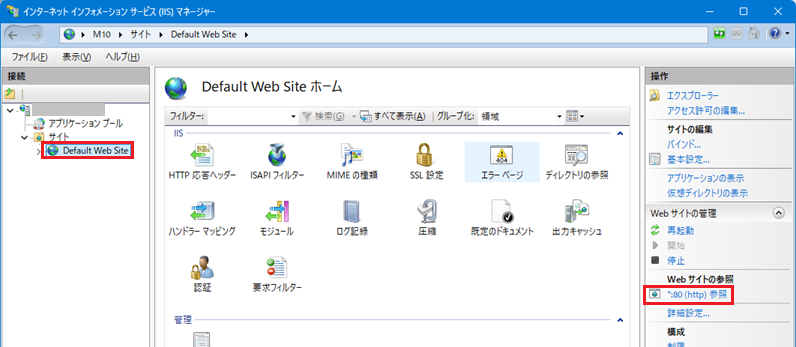 ブラウザーから以下の URL を表示するか、IIS マネージャーの左側のツリーで「サイト」→「Default Web Site」を選択し、右側の「Web サイトの管理」パネルで「80(http) 参照」をクリックします。