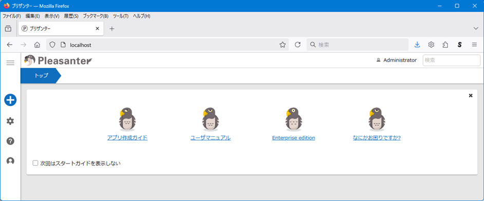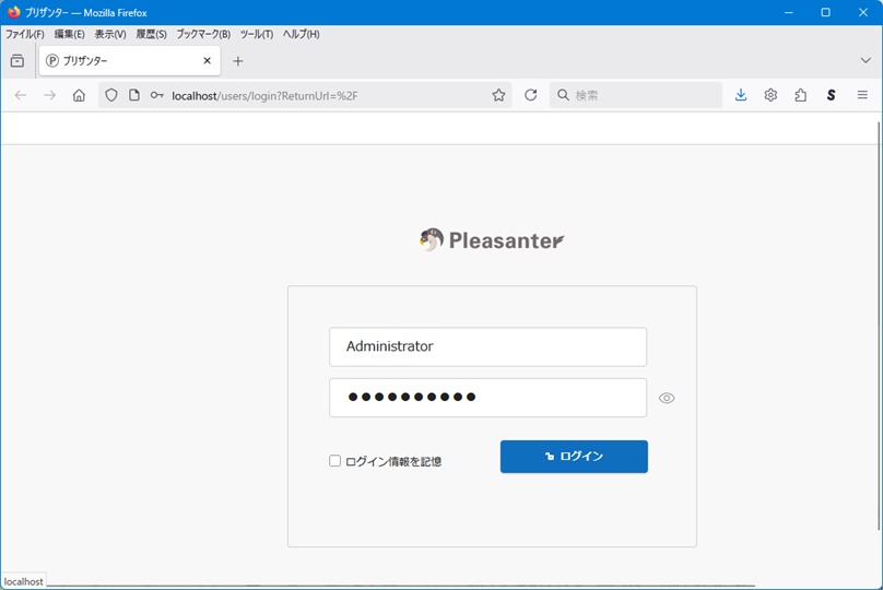 ※他PCからアクセスする場合は、localhost の部分を、Pleasanter をセットアップした PC の IP アドレス(またはPC名)に変更してください。